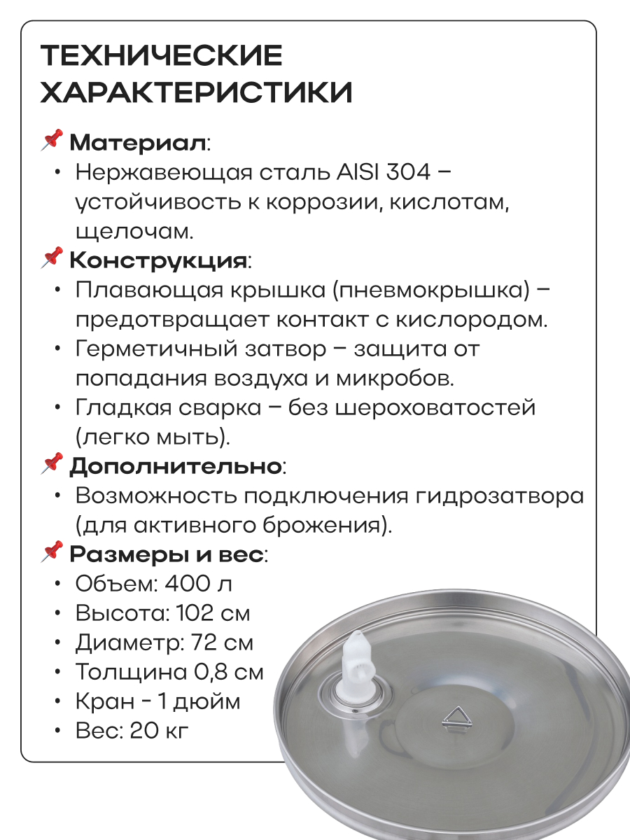Емкость с пылезащитной и пневматической (плавающей) крышкой из пищевой нержавеющей стали. Подходит для бурного брожения (первичное), для тихого брожения (вторичное) и для длительного хранения (созревания продукта).